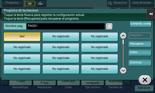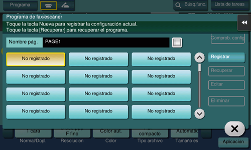Cuando se registra un programa de escáner/fax, es posible recuperar la combinación de las opciones de configuración desde la pantalla principal con una sola tecla. También puede incluir un destino en el registro del programa.