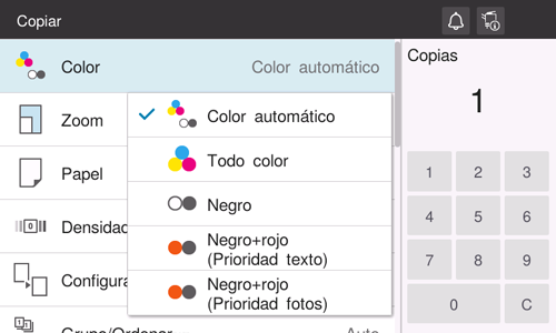 [Negro] | Realiza la copia en blanco y negro, independientemente de que el original escaneado esté en color o en blanco y negro. |