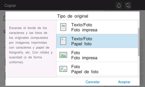 [Foto - Foto impresa] | Permite copiar un original que conste únicamente de fotos con un nivel de calidad de imagen óptimo. Seleccione esta opción para escanear originales impresos como, por ejemplo, folletos y catálogos. |