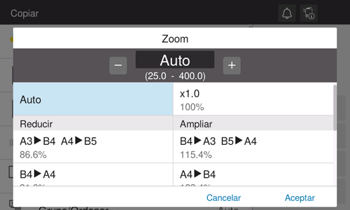 Zoom fijo | Seleccione un factor de escala predefinido para copiar un original de tamaño normal en papel de tamaño normal. La bandeja de papel se cambia automáticamente en función del factor de escala elegido. |