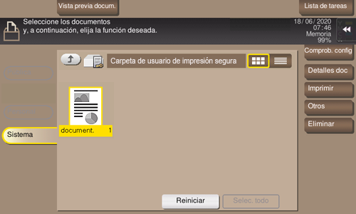 Si [Funciones prohibidas si falla la autenticación] (Aquí) tiene el valor [Modo 2], es necesario introducir la contraseña para seleccionar un archivo de la carpeta de usuario de impresión segura. Es preciso introducir la contraseña de cada archivo incluso aunque los documentos seguros tengan el mismo ID de documento. Por lo tanto, el nivel de seguridad es superior al del [Modo 1] predeterminado.