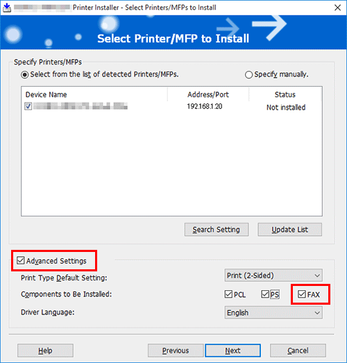 Seleccione la casilla de verificación de [Ajustes avanzados] y compruebe que [FAX] esté seleccionado en [Componentes que se instalarán].