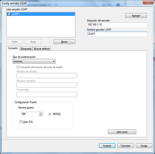 Ficha [Conexión] | Configura el tipo de autenticación y el puerto para la conexión al servidor LDAP. | |