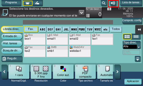 Si toca el icono de voz en la pantalla en el modo de escanear/enviar por fax del estilo clásico, la máquina lee en voz alta el procedimiento de funcionamiento cuando introduce directamente un número de fax. Además, cuando selecciona un destino en la libreta de direcciones o el historial, esta máquina lee en voz alta el procedimiento de funcionamiento. Esta opción sirve para evitar que un fax se envíe a un destino incorrecto.