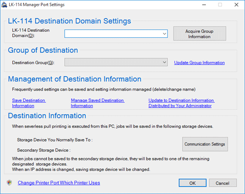 Puede cambiar el grupo de Serverless Pull Printing de destino en función de la ubicación en la que desee realizar la impresión Serverless Pull Printing. Para ello, guarde la información de destino por medio de LK-114_ManagerPort.