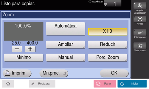 [Ampliar] | Permite seleccionar una escala predeterminada para ampliar originales de un tamaño estándar a un tamaño de papel también estándar en la copia. |