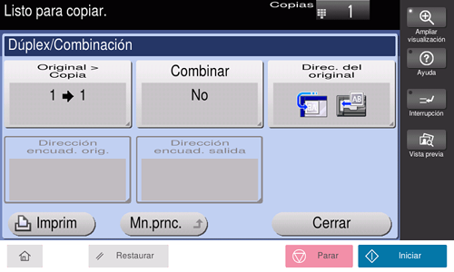 [Original > Copia] | Permite seleccionar una combinación de cara del original que se debe escanear (Normal/Dúplex) y cara del original que se debe imprimir (Normal/Dúplex). Para escanear un original a 2 caras, indique si se debe ajustar el original para encuadernación arriba o para encuadernación izquierda/derecha en [Dirección encuad. orig.]. Para realizar una copia a 2 caras, indique si se debe ajustar la copia para encuadernación arriba o para encuadernación izquierda/derecha en [Dirección encuad. salida]. |