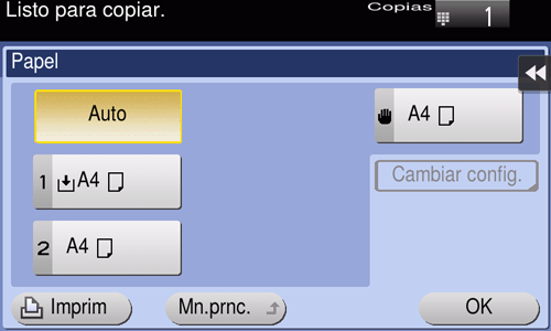 [Automática] | Selecciona automáticamente el papel que se ajuste al tamaño del original al realizar una copia. |