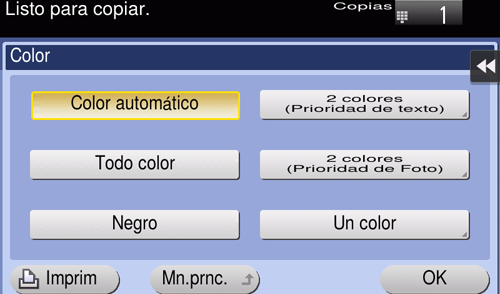 [Color automático] | Selecciona automáticamente [Todo color] o [Negro] según el color del original escaneado para la copia. |
