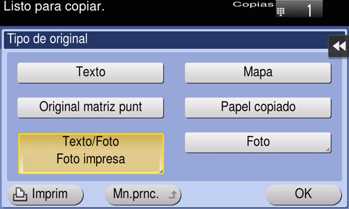 [Texto/Foto] | Permite copiar un original que conste de texto y fotos, con la máxima calidad de imagen. Esta función acentúa los bordes de cada carácter y reproduce fotos más suaves.