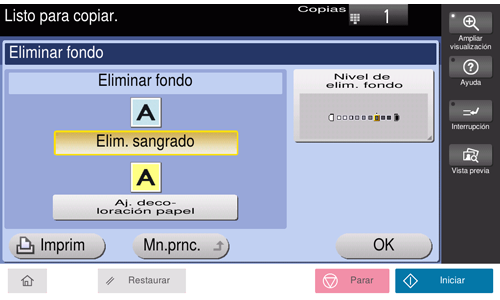 [Nivel de eliminación de fondo] | Permite ajustar la densidad del color de fondo de un original con fondo de color. Si se selecciona la opción [Auto], la densidad del color de fondo se determina de forma automática y el original se copia con una densidad del fondo óptima. |