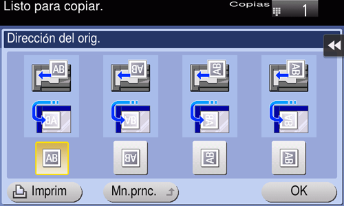 Toque [Original/Densidad] - [Dirección del original] y especifique la dirección de carga del original.