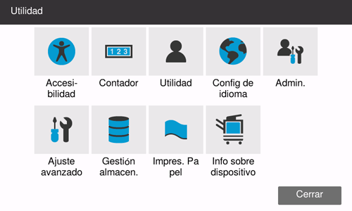 En [Accesibilidad] de [Utilidad], es posible especificar las opciones de accesibilidad del entorno de funcionamiento, como el ajuste del panel táctil o cambiar los sonidos de las teclas.