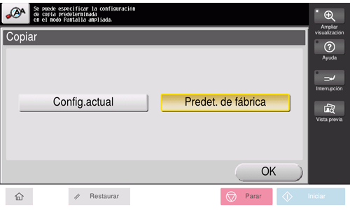 Permite cambiar la configuración inicial (cuando se enciende la máquina o se pulsa el botón Reiniciar) en el modo de pantalla ampliada. Puede modificar la configuración predeterminada seleccionando [Configuración actual] después de cambiar la configuración de cada función (predeterminado: [Ajuste de fábrica]).