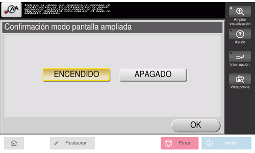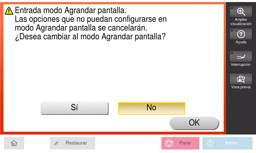 Si no se realiza ninguna operación con la máquina durante un tiempo, el modo de pantalla ampliada se cancela automáticamente. Si es necesario, puede visualizar la pantalla para confirmar si se debe cancelar el modo de pantalla ampliada.