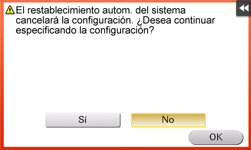 Seleccione [Accesibilidad] - [Confirmación restablecim. automático del sistema] y seleccione si se debe comprobar la cancelación del modo de pantalla ampliada mostrando la pantalla (predeterminado: [No]). Al mostrar la pantalla, seleccione la duración del tiempo de visualización de la misma.