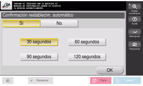 Si no se realiza ninguna operación con la máquina durante un tiempo, la configuración se reinicia automáticamente. Si es necesario, puede visualizar la pantalla para verificar si se debe restablecer la configuración.