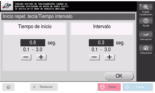 [Intervalo] | Cambie el intervalo para mantener pulsada una tecla e introducir caracteres sucesivos. [0,3 s] es la opción predeterminada. |