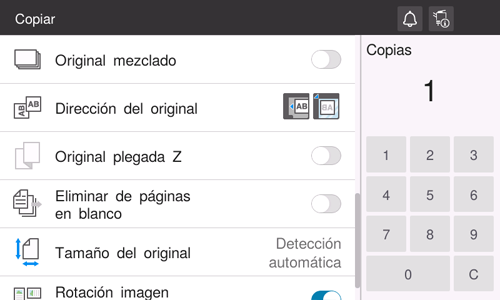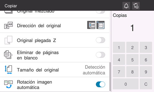 En [Rotación automática de imagen], seleccione el elemento de acuerdo con la orientación actual del papel y el original y, a continuación, toque [OK].