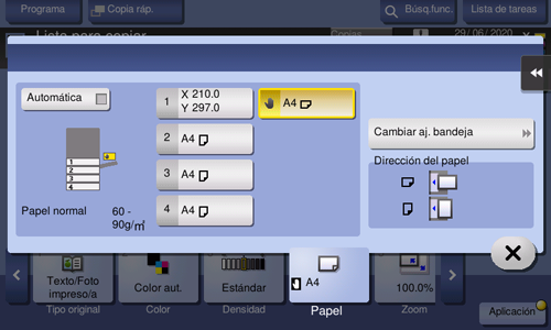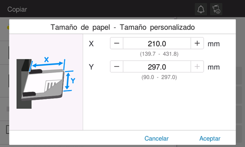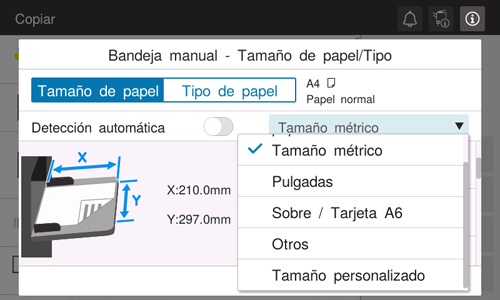En la pantalla de papel del modo de copia, especifique la bandeja que contiene el papel de tamaño personalizado; esto le permitirá imprimir en papel de tamaño personalizado.