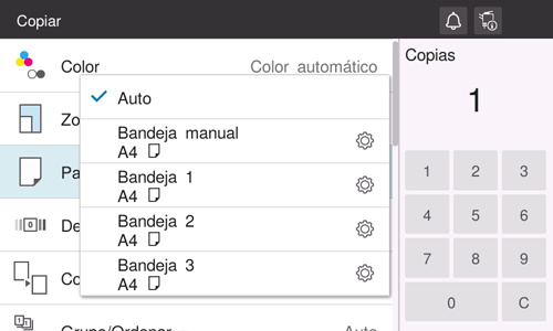 [Papel] | Seleccione la bandeja de papel en la que se ha cargado el papel para copia. |