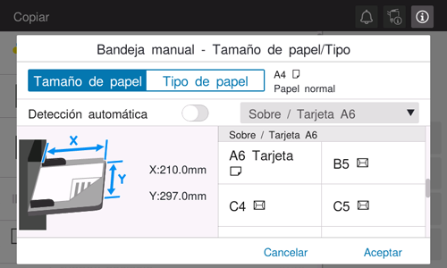 Aparece la pantalla de selección del tamaño y del tipo de papel.
