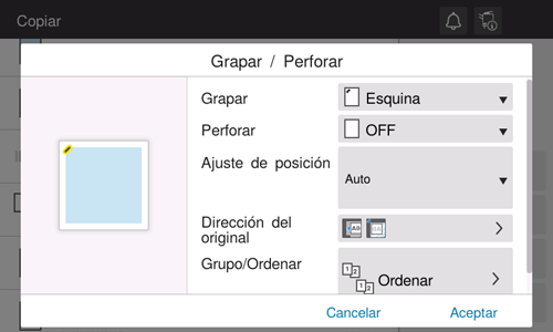 [Ajuste de posición] | Seleccione la posición deseada de las grapas o las perforaciones. Al asignar el valor [Auto], las posiciones de grapado y perforado se determinan automáticamente en función de la dirección del original cargado. |