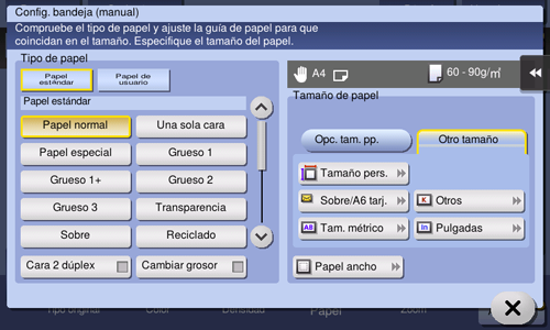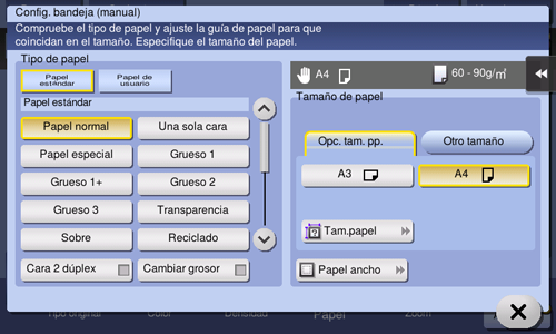 Pulse [Papel], seleccione Bandeja 1, Bandeja 2 o Bandeja manual, y pulse [Cambiar la configuración de bandeja].