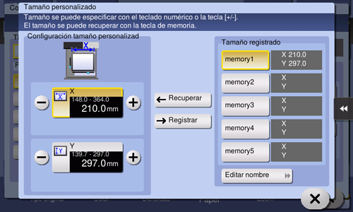 En [Tamaño registrado], seleccione la tecla de memoria donde desea registrar los datos.