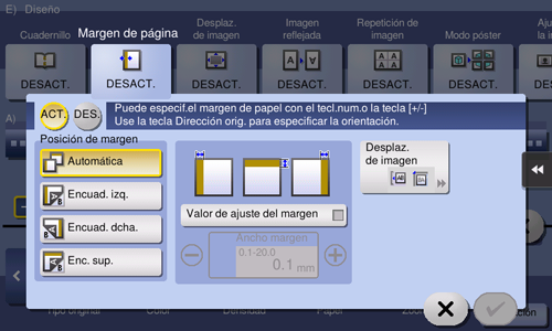 [Posición de margen] | Seleccione la posición para crear el margen de página para el encuadernado. Al seleccionar [Auto], la posición de encuadernado se establece de manera automática. |