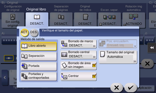 Toque [ON], seleccione [Libro abierto] y, a continuación, toque [Borrado central].