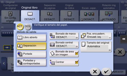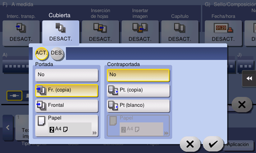 [Cubierta] | Utilice esta opción para copiar las portada y la contraportada por separado al copiar un original con portada o contraportada. Al copiar un original sin portada o contraportada, es posible utilizar esta función para introducir hojas de papel en blanco como portada y contraportada. |