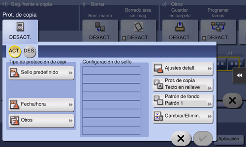 Toque [ON] y configure los elementos correspondientes de la función de protección de copia.