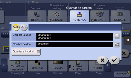 Toque [ON], seleccione la carpeta de usuario que se debe utilizar para guardar en [Carpeta de usuario] y, a continuación, toque [OK].