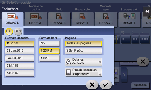 [Fecha/Hora] | Seleccione un formato para la fecha y hora que debe imprimirse. Se añade el sello de la fecha/hora de escaneado del original. | |