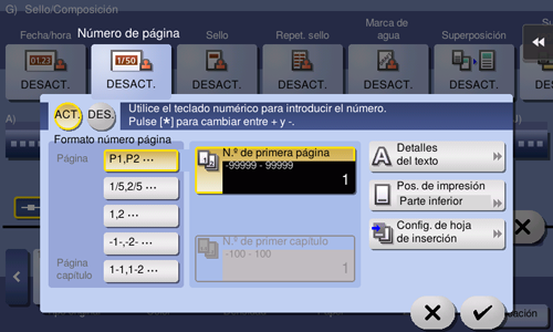[Número de control de distribución] | Imprime el número de control de distribución. Especifique el número de control de distribución empleando un valor entre 1 y 99999999. | |