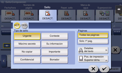 [Ajustes detall.] | En el caso de las marcas de agua de seguridad ocultas, especifique el tamaño, la densidad y si se deben ubicar encima o debajo del texto original. | |