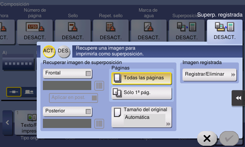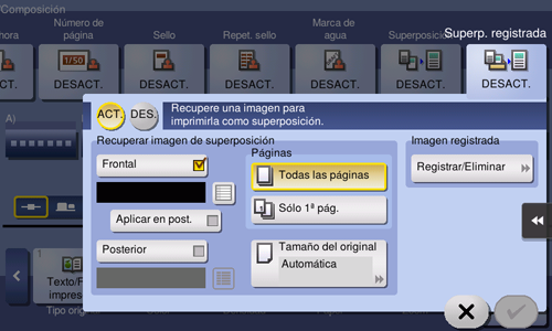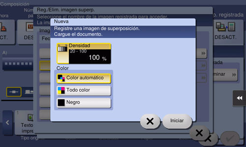 Cargue el original que contiene la imagen de superposición que se va a registrar, modifique la configuración de imagen según sea necesario y, a continuación, toque [Iniciar].