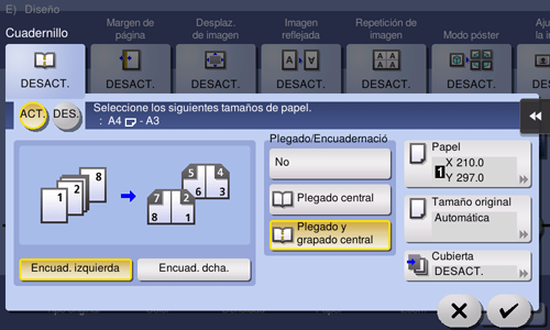 Para utilizar la función de plegado y grapado central, se requiere una opción adicional. Para obtener más información sobre la opción necesaria, consulte Aquí.