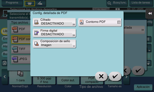 Si selecciona el formato de archivo [PDF] o [PDF compacto], puede configurar las opciones de PDF.