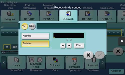 [Boletín] | Seleccione esta opción para recibir un archivo almacenado en una carpeta de usuario de boletín. Introduzca el número de carpeta usuario de la carpeta de usuario de boletín en la máquina de destino donde está almacenado el archivo. |
