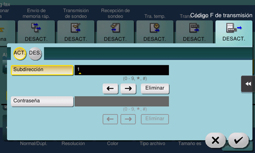 [ACT.]/[DES.] | Seleccione [ON] para definir el código F de transmisión. |