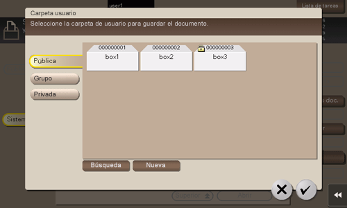 [Búsqueda] | Especifique el número de la carpeta de usuario para buscarla. Las carpetas de usuario se muestran en función de los caracteres de búsqueda que se hayan especificado durante el registro. |