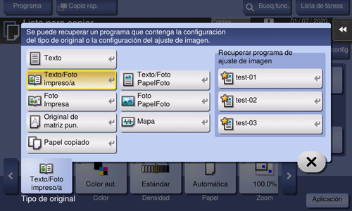 [Recuperar programa de ajuste de imagen] | Llame el programa de ajuste de la calidad de imagen. Se aplica el contenido registrado de un programa. En el programa de ajuste de imagen puede registrar los ajustes de [Tipo de original], [Densidad], [Eliminación de fondo], [Mejora del texto], [Invertir neg./pos.], [Color de fondo], [Ajuste de color] e [Imagen reflejada]. Para obtener más información sobre el procedimiento de registro, consulte Aquí. |