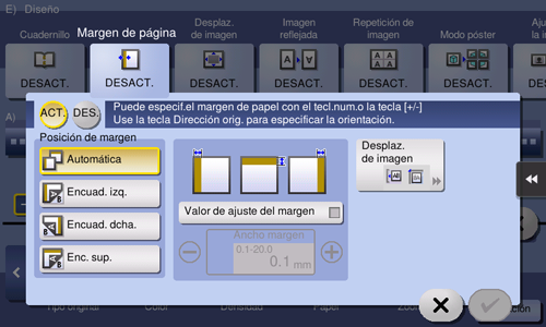 [Valor de ajuste del margen] | Seleccione [Valor de ajuste del margen] y especifique el valor del margen en [Ancho margen]. |