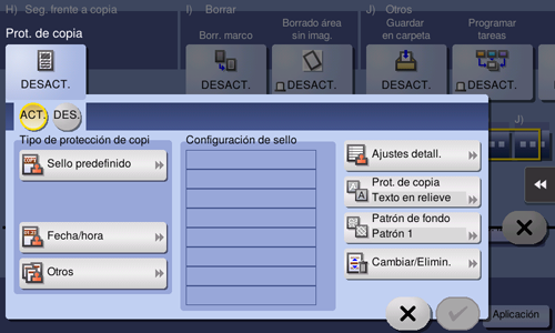[Tipo de protección de copia] | Seleccione un sello utilizado. También pueden imprimirse la fecha y hora.