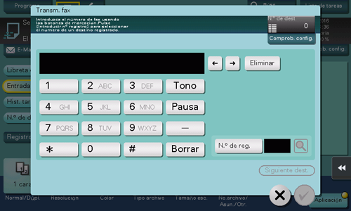 Introduzca el número de fax del destino. Si toca [N.º de reg.] puede especificar un destino de fax mediante un número registrado.