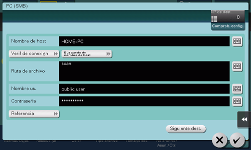 [Referencia] | Especifique la carpeta compartida del ordenador deseado mediante su referencia en la red. Cuando aparezca la pantalla de autenticación, introduzca el nombre y la contraseña del usuario que tenga privilegios de acceso a la carpeta compartida. Después de la autenticación, el [Nombre de host] y la [Ruta de archivo] se definen automáticamente. La función Referencia puede fallar en las siguientes condiciones.