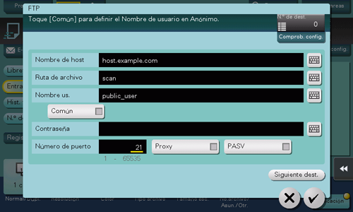 [Común] | Si no se requiere autenticación en el servidor FTP, asigne a esta opción el valor ON (predeterminado: DESACT). |