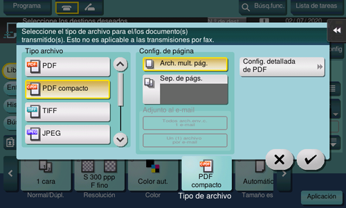 [Configuración detallada de PDF] | Si selecciona el formato de archivo [PDF] o [PDF compacto], puede configurar las opciones de PDF. Se puede optimizar la seguridad adjuntando una firma digital que identifique al autor del documento, mediante cifrado de archivos, etc. Para obtener más información, consulte Aquí. |